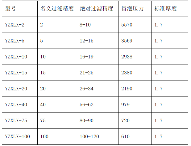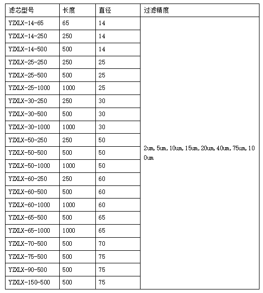 圓柱形濾芯型號匯總表